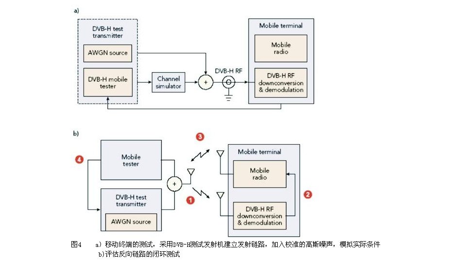 移动电话中DVB-H部分从测试发射机接收到DVB-H信号,移动电话便运行应用程序起动无线的反向路径,例如,将通过DVB-H信道接收到的综合数据由反向路径发射。移动无线测试仪接收和分析这些信号,与DVB-H测试发射机建立的通信使回路闭合,计算闭环数据包的误码率。然后对DVB-H信号插入高斯噪声,由测试系统求得接收机的极限特性。