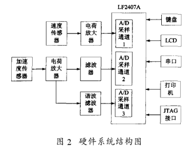 硬件系统基本结构如图2所示,加速度传感器安装在振动压路机压实轮的轴承上,用来采集振动轮在垂直方向的加速度信号,此信号包含来自轴承、激振马达等的干扰波。经电荷放大器放大后,分为两路。一路经滤波器滤波,去掉干扰波信号后,送入A/D采样通道2;另一路经谐波滤波器,送入A/D采样通道3,此处谐波滤波器的作用是仅使振动产生的一次谐波通过。在LF2407A内部对两路信号首先进行A/D转换,然后再对数字信号分别进行快速傅立叶变换,最终得到一个与路基压实度成比例的值,通过对该值和压实度值进行标定,可以用来准确表示压实度值变化。