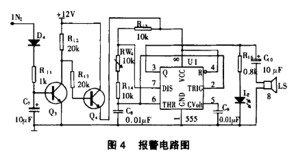 如图4,芯片555及R14、R15、RW4、C8构成方波发生器。当被测线圈不存在匝间短路时, IN2(接图2的OUT点)有正弦信号输入,该信号经过D4,C7的整流滤波后,使Q3饱和导通,Q4截止,从而+12V电源不能为555供电,555不工作,即无报警信号输出;若被测线圈有匝间短路时,IN2无正弦信号输入,使 Q3截止,Q4导通,从而+12V电源通过Q4为555供电,555工作,由555的3管脚输出连续的方波信号,驱动红色发光二极管L2发光,进行光报警,同时驱动扬声器,进行声音报警。