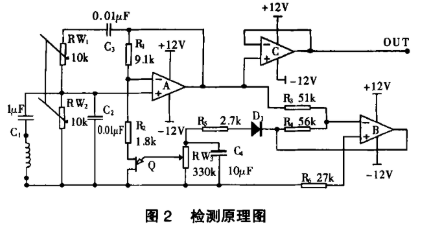 如图2,此电路是利用感知振荡器的起振和停振来检测被测线圈的好坏。当未接线圈时,该振荡器是由运放A及RW1、RW2、C3、C2、R3、R4组成文氏桥振荡电路,通过调节同轴电位器RW1=RW2=R,使当前的振荡频率F=1/2πRC,约为5.5kHz;当接入待测线圈且无故障时(同时电容C1介入),此电路变成LC振荡器与文氏桥振荡器的融合电路,其中以LC振荡电路为主,当前的振荡频率则由被测线圈的电感量和电容C2决定,因电容C1取值较大,L电感量较小,其振荡频率经推导结果为 (OUT点输出正弦信号)。当被测线圈内部匝间有短路时,由振荡电路及磁路理论可知:线圈电感量将速降, Q值降低,线圈工作在低阻抗、高阻尼状态,迫使感知振荡电路停振(OUT点无正弦波输出)。电路中的运放C构成了电压跟随器,以提高振荡器的负载能力。运放B及R3、R4、R5、RW3、C4、D1组成比例放大及整流滤波电路,使结型场效应管Q工作在可变电阻区,从而实现对振荡器输出的正弦波稳幅。