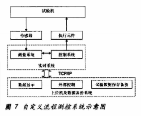 本系统是在LabVIEW编程平台下开发的基于LabVIEW RT技术的自定义流程测控系统,采用上、下位机结构,上位机主要完成对试验的监控、参数设置、数据记录和显示、试验数据保存备份等功能,并将用户下达的命令和配置参数传送到下位机。下位机运行LabVIEW RT系统,对系统实行实时管理,并根据上位机下达的命令,完成数据采集和控制等特定功能,并将试验数据和当前试验状态返回到上位机。系统框图如图7所示。