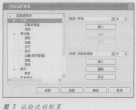 试验流程配置如图3所示。在左侧的试验流程列表中,最高层次是“试验顺序树”即整个试验完整流程,然后向下一个层次是“阶段”,最低层次就是所说的“步续”。在用户进行自定义流程配置之前,系统已经预制了5个特殊阶段:开始,停车、紧急停车、空闲和断点继续。在该界面右侧区域,用户可以点击相应的按钮来插入、删除、重命名某个自定义的阶段或步续。