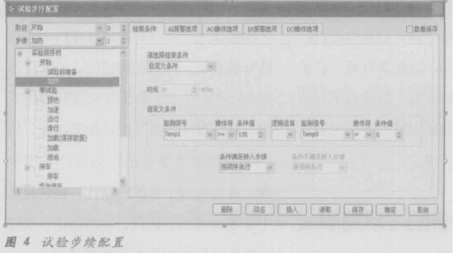 步续配置如图4所示,根据实际经验,每个步续的结束条件可能不同,例如有时可能只是简单的让某个步续持续运行一段时间,有时某个步续只是为下一个步续提供试验条件,如在油品测试中,有些测试是要在油的温度达到120摄氏度以上的条件下进行的。有时试验条件要求的某个物理量的当前值并没有通过数据采集传入计算机而是通过传统仪表进行显示。如油品测试中,有时需要水压达到要求后,才能继续进行试验,而水压的当前值是通过传统仪表显示的。