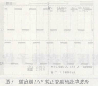 图2和图3是RDC电路在4对极感应电机测速系统的试验波形,此时电机转子频率为63.4Hz,旋转变压器的原边输入励磁信号频率设置为10KHz。其中图2是RDC电路的输入波形,即由旋转变压器副边的两个绕组分别输出的正弦信号和余弦信号;图3是RDC电路的输出波形,即以正交编码脉冲形式提供给DSP的位置测量信号。参照图2可见,输入波形的品质好,达到了RDC的设计要求;输出的转子位置信号波形符合DSP的QEP电路接收要求,而且脉冲正交性好,无毛刺,保证了DSP对位置信号的采样精度。