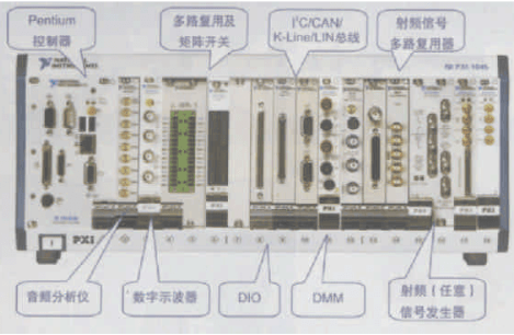 图2示出一组典型的用于汽车电子产品检测的PXI模块化仪器,其中包括了基于Pentium CPU的PXI控制器、由数字万用表和多路复用开关及矩阵开关组成的多路电流、电压测试系统、用于产生汽车收音机电台信号的射频信号发生器、汽车收音机音频分析仪等设备。为了实现自动化测试,汽车电子产品厂商通常利用产品本身具有的总线,如CAN、K-Line等,开放特定的控制指令用于产品状态控制,从而无需人工干预。因此在这些模块化仪器中,通常包含一个总线控制器(如CAN、K-Line、LIN控制器等)。除此以外,通常配置一块具有宽电压输入输出和光隔的DIO卡,用于与自动化生产线之间进行时序同步和夹具控制等。