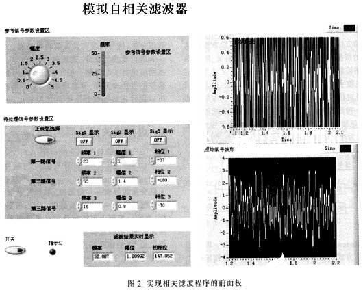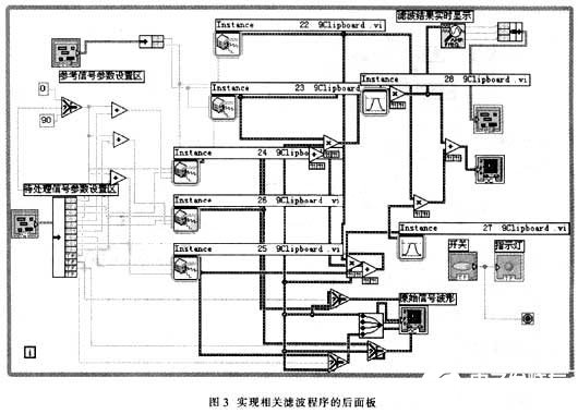 后面板如图3所示,后面板中的控件与前面板中的控件相对应,并且通过连线、添加程序以及加入各种信号等措施进行编程,实现自相关滤波的功能,同时通过在前面板设置各种不同的参数,成功地运行程序,实现所要求的目标,为了实现这一功能,笔者又添加了激励信号源、滤波器加法器和乘法器等各种运算器,经过运行程序,测试结果显示能够实现从一个包含多种频率成分的信号中提取出所需单一频率信号的功能,相当于实现了滤波,由于这种滤波的思路是从相关函数的定义出发的,因此成为相关滤波器。
