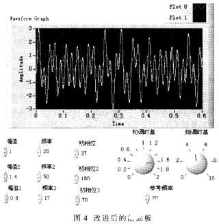 上述实现相关滤波的基础上,还可以进一步改进,使程序更加简单,改进后的前面板如图4所示,将多路信号集于一个图中显示,更加直观,同时增加了粗调和细调旋钮,显得更加精确。改进后的前面板结构更加紧凑,设计也更加合理。