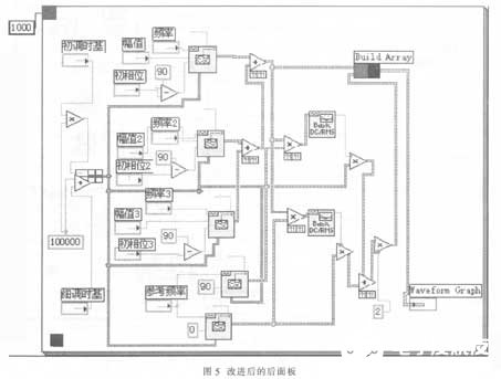 改进后的后面板如图5所示,可以看到,滤波器用一个信号平均值测量VI代替了原来的滤波器VI,这是因为相关滤波中,滤波器的作用实际上就是求取测试信号的直流分量,因此这样同样可以实现相关滤波,利用相关函数,可以识别并提取混淆在噪声中的信号,即进行相关滤波。