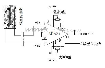 从温度传感器送来的信号进入放大器,放大器采用AD521 集成测量放大器,这种放大器具有高输入阻抗,低失调电流,高共模抑制比的特点,其增益可以在0.1-1000范围内调整,增益的调整不需要精密的外接电阻,各种增益参数已进行了内部补偿。它能很好的抑制由工频、静电和电磁耦合等引起的共模干扰和电源电压噪声,其放大电路原理如图3所示。