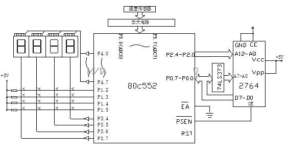 系统的硬件部分主要由前端输入电路、人机界面电路、CPU及外围电路组成。所需要的元器件有:CPU采用PHILIPS 80C552、EPROM为2764、传感器采用PT温度传感器(精度等级为0.5级,测量范围-80℃--+180℃)、AD521测量放大器、4片数码管、4x4键盘。