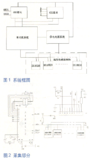 本装置结构(图1)可以大致分为:采集部分、供电电源系统、通讯部分。采集部分是通过主核心芯片AT89S52单片机和DALLAS最新单线式数字温度传感器DS18B20组建采集网络完成。DS18B20采集温度测量范围为-55~+125℃,多个DS18B20 可以并联在唯一的三线上,实现多点测温,可节省大量的引线和逻辑电路。DS18B20 非常适用于远距离多点温度检测系统,通过两种通讯方式实时上传温度数据,这两种通讯方式为 RS485通讯和RS422通讯,在RS485通讯中用ADI公司的串行RS485接口芯片ADM2483,它是双电源供电,输出和输入完全隔离的RS485芯片,可以加强对有效信号的接受与发送,增加了远距离通讯的可靠性。而RS422通讯实现了全双工的通讯机制,在另一端采用光耦隔离的方式,将电源和信号隔离,增加了信息传输的正确率和抗干扰性,保证了信息的完整性。