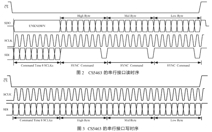 CS5463的串行接口使用了包括2条控制线CS、SCLK和2条数据线SDI、SDO的外接方式。串行接口集成了带有发送、接收缓冲器的状态机,状态机在SCLK的上升沿解析8位命令字,根据对命令的解码执行相应的操作,或者为被寻址的寄存器的数据传输做准备,内部寄存器都是24位。读操作需将被寻址的内部寄存器的数据传送到发送缓冲区;写操作在数据传输前要等24个SCLK周期。
