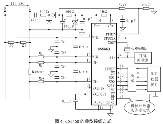 该电路中用于监测电流的分流电阻器串联在电源的火线端,因为在大多数住宅电能测量应用中,电度表分流器接在火线上有助于发现窃电行为。从这种类型的分流电阻器得到的共模输入电压应以火线电压为参考.这意味着CS5463的输入共模电压相对于地电位会在很高的正电压和负电压之间振荡。因此,在设计CS5463的数字输出接口与外部数字接口(如其他通信网络)时应谨慎。CS5463的数字串行接口引脚必须与外部数字接口隔离,使测量端的参考地电位与外部接口地参考地电位不相互影响,另外,CS5463及其电路必须密封绝缘以防触电。