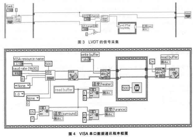 首先要对输入信号进行设置,如波特率、数据位、停止位、是否有奇偶校验等等。必须跟PC机上面的设置相同。接着是打开VISA,通过VISA往仪器里面写代码和关闭VISA。向ADAM一4018模块发送命令将采集处理后的信号通过串口发送到Lab-view中,在L,abVIEW中输出热电偶的温度信号,而不需要另外运行Advantech I)eviee Manager软件。如图4就是VISA通讯的串口程序。Write buffer中的#01则是将0l地址输出的数据传到LabVIEW当中。在写write buffer的时候,要注意将其属性改为可以写代码,否则不能输出结果。数据传输后,从ADAM一4018中返回的是字符串,并且带有“》”、“+”等符号,要将其类型进行转换成数据输出。采集的温度信号分别是炉体的温度、棒材的温度和差动变压器附近的环境温度。其中只有炉体的温度是可控的。