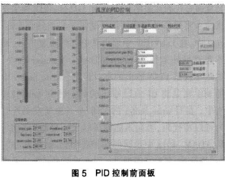 PID控制前面板如图5所示。控制效果通过调节PID参数来整定。作为一个比较经典的控制算法,PID控制常再温度控制中使用,并且有较好的控制效果。本系统是通过采集读人温度信号到PID模块,通过PID模块来控制加热的输出功率,从而使温度以较好的响应逼近目标温度。P、I、D参数的具体数值根据实际的情况进行调节。PID模块中带有参数的自整定,可以根据当前的环境情况对噪声的状况进行分析。自动对PID参数进行设置。
