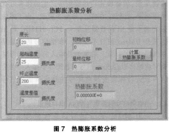 数据的存储部分如图6所示,在开始运行程序后,程序会给一个提示存储文件,默认名字为filel,txt,用户可以对其进行修改,系统将根据采样速率记录下时间、温度以及对应的位移量的值。数据分析的前面板如图7所示。通过设置温度段,用户可以调用存储的文件。系统将自动从存储的数据文件中调出用户输入的温度值对应的位移量,根据材料的长度和温度变化的值。