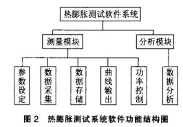 LabVIEW是一种基于图形化编程语言的虚拟仪器软件开发平台,具有功能强大的函数模块和通讯协议,大大减少了软件开发的周期,特别是在测试和控制系统当中,能方便地进行数据采集和数据分析。本系统将热膨胀测试分为测量模块和分析模块两部分,热膨胀仪测试系统的软件功能结构如图2所示。