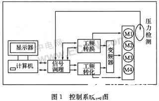 当系统开始工作时,首先在设定水压值,之后启动系统。系统首先启动M1水泵,M1水泵的转速开始增加,水管水压逐渐增大,压力检测仪检测水管压力,实时传给计算机,计算机通过实时计算来判断用户用水量大小,如果在经过T时间达不到设定值系统此时判断用水量大,于是将M1泵由变频控制转为普通的工频控制,实现全功率启动,再将M2水泵变频启动,水泵的转速增加,水压进一步加大,直到当前的水压值达到设定值,根据以上原理,在用水量增多时,则依次开启水泵,反之,当用水量减少,变频减小水泵的转速到下限值时,则依开启的顺序关闭水泵,使压力稳定在设定值,实现了恒压供水,整个控制过程是动态的,同时是自调整的,不需人为控制。