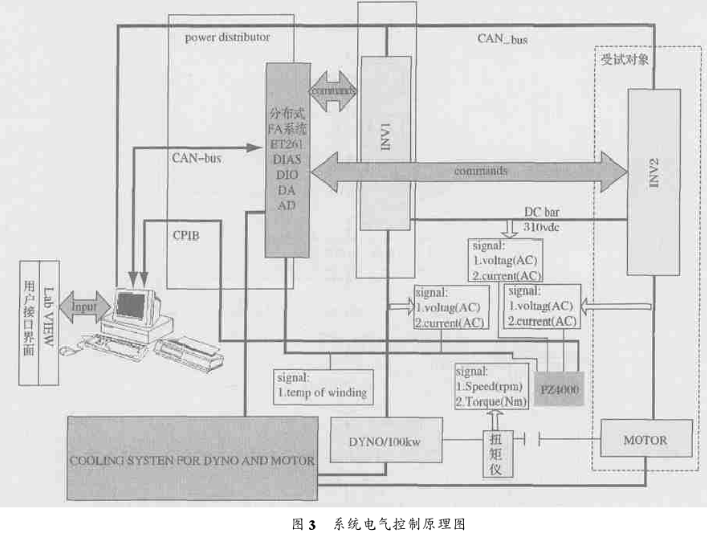 受试对象是指被测电机(MOTOR) 及其变频控制器( INV2) 。主变频器( INV1) 和测功电机(DYNO) 组成测功机。电量信号采集处理设备PZ4000 采用GPIB 总线实现与上位控制机的通信。扭矩仪采集的扭矩和转速频率信号经过MP60 (频率电压变换器) 送给PZ4000 处理后,再传送到上位机。