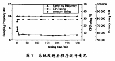 鉴于上述问题的所在,在进行系统改进时,还是采用三种方式记录数据,只是在表格记录数据时,限制表格记录数据的内存大小。经过改进后的程序以10 Hz的采样频率测试,测试结果如图7所示。从图中看出,改进后的测试系统在连续运行5 h,采样频率依然稳定,计算机内存只是在开始的3 min内增加,之后到达一个稳定值。CPU的使用率同样是在开始的3 min内有所增加,之后迅速回到7%并保持稳定。