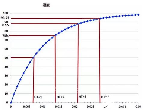 2个减半时间常数后,温度达到75˚C;3个减半时间常数后,温度达到87.5˚C,以此类推,每经过一个半跃阶,就越接近100˚C。
