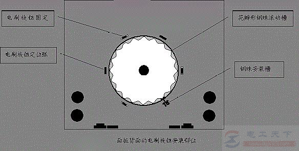 2、观察面板背面的电刷旋钮安装部位,由3个电刷旋钮固定卡、2个电刷旋钢定位弧、1个钢珠安装槽和1个花瓣形钢珠滚动槽组成。