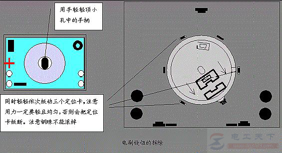 2、若发现白线与电刷安装卡方向相反,则必须拆下重装。拆除时用平口起子对称地轻轻撬动,依次按左、右、上、下的顺序,将其撬下。