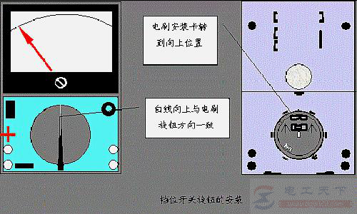 1、电刷旋钮安装正确后,将其转到电刷安装卡向上位置,将档位开关旋钮白线向上套在正面电刷旋钮的小手柄上,向下压紧。