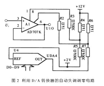 图中U4的基准电压选为2V,则U4的输出电压范围为0~4V。接入R3、R4、R5的目的是提供一个调节范围的中心位置,使电压能够双向调节。对D707K及图示的参数,失调电压与D/A转换器的输出电压间的关系是线性的。经过实际测试,其灵敏度为7.35μV/V,即0.028V/bit,总调节范围为±14.7μV。运算放大器A2采用与A1同样的调零方法。