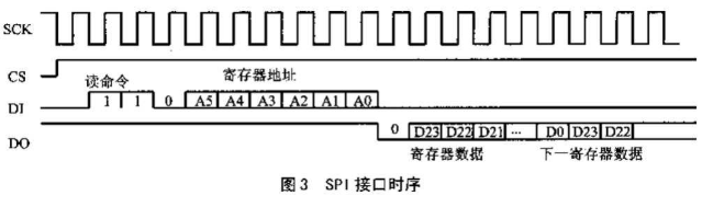 当CS为高电平时,DI引脚在SCK时钟的上升沿输入9位地址信号。其中高三位为写入地址的标志位;A5、A4为保留位,可选0或1;有效地址为低4位。在SCK的上升沿检测到地址的最低有效位A0输出后,DO引脚在SCK的下降沿输出相应寄存器地址里的24位数据,高位在前,低位在后。当24位数据输出后,如果CS信号仍然有效,则DO引脚将继续输出下一个地址的寄存器数据,直到所有的数据输出为止。