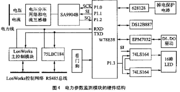 该系统中采用SA9904B芯片,大大减少了软件中的计算工作,提高了系统的测量精度。同时采用LonWorks总线传输实测数据,也有效地提高了系统的抗干扰能力及稳定性。