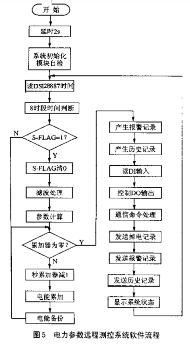 电力参数远程测控系统的软件包括系统初始化、时间读取与时段判断程序、电力参数计算、通信命令处理、产生各种历史及报警记录、显示状态等模块。软件流程如图5所示。