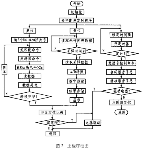该系统软件可采用模块化设计方法,用汇编语言来实现。包括主程序、中断服务程序、温湿度检测程序、语音处理程序、定时驱动程序、显示子程序等。主程序以循环方式工作,主要完成中断初始化、键盘扫描、温湿度检测、语音处理及显示子程序的循环调用等功能。