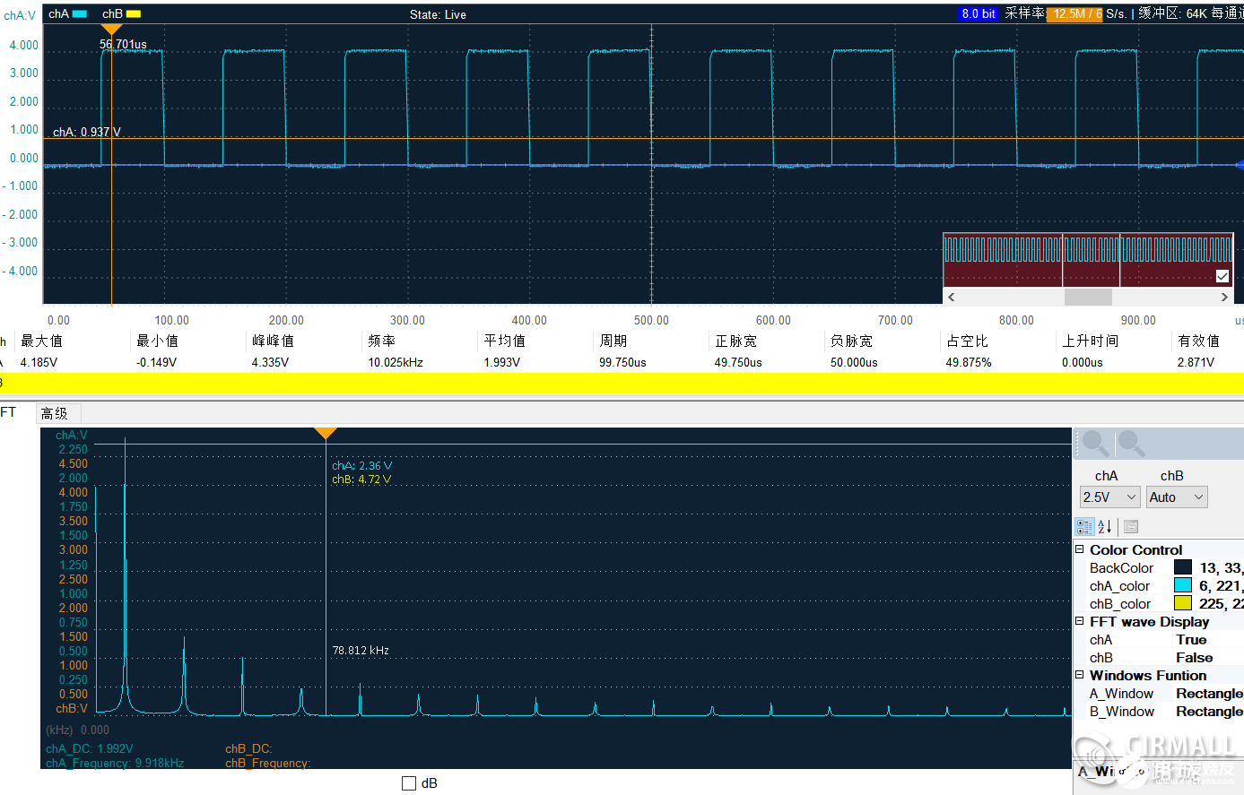 然后我们再测一下一个方波信号对应的FFT频谱的波形: