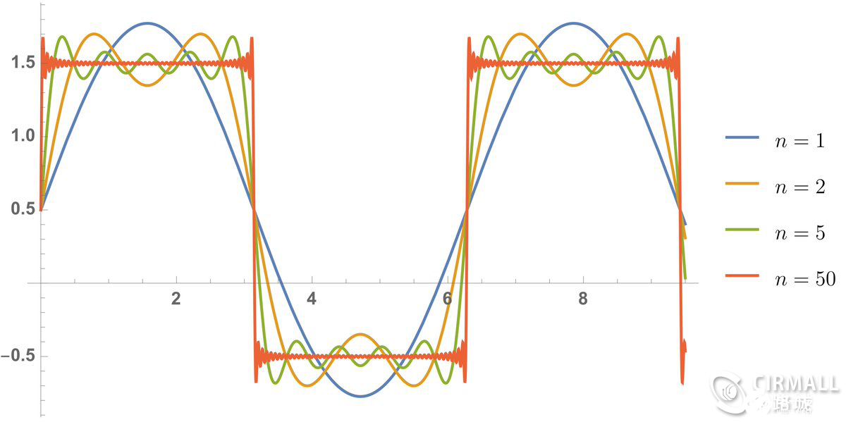 理论上,这个方波是由无限个正弦波分量叠加而成的。工程上,我们其实不需要去处理无限多个分量,因为这样工作量太大且没有必要,一般只是取前多少个分量进行分析处理就可以近似达成目标了。下图所示,一个方波,取前多少个正弦波分量叠加以后变成的不同的方波。可以看到,取的分量数(n)越多越接近原始方波,其他现实波形的道理是一样的。