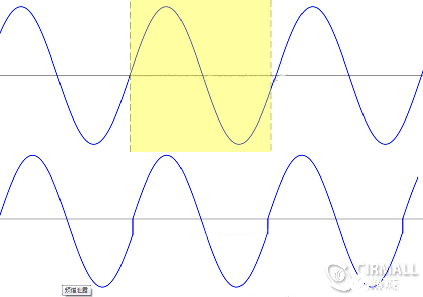 上图中的假如一个正弦波(上方)被采集到,如果在做FFT分析的时候由于参与FFT点数的设置,可能只取了黄色区域的局部波形数据进行FFT计算。那么在FFT算法看来,它会认为FFT针对的信号是黄色部分的周期性延宕,如图中下方的波形所示。