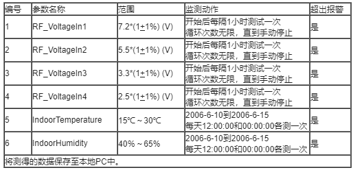 RF_VoltageIn1测量为每天每隔1小时测试一次的DCV的无限测量(手动停止),为自动触发形式。告警的方式为测量值上下限告警(上限为7.272V,下限为7.128V)。将每天的测量作为一个大的测量循环间隔(循环周期为24),每小时的测量为一个小的测量循环(循环周期为1)。