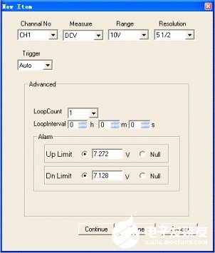 进入新建任务制定小的任务项目设置,按照制定的需求对项目的不同参数进行设置,如下图即使针对需求1的项目设置,其中Advanced框中的LoopCount表示进入该项目进行测量的次数,LoopInterval表示采数的时间间隔。Alarm框中设定报警的上下限值。