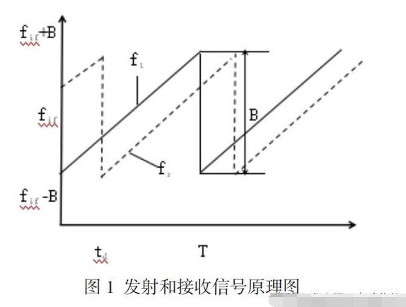 FMCW雷达通过发射频率调制的连续波信号,从回波信号中提取目标距离信息。FMCW分为线性调频和非线性调频(如正弦波调频)两种。使用非线性调频方式时,每个目标产生的差拍频率不唯一,一般只适用于单目标的场合,如雷达高度计等;线性调频方式适合于用FFT算法测量频率,应用最广。这种方式使每个目标产生的差拍信号都是单一频率,但其对线性调频的线性度要求很高,比较常用的调制波形是三角波和锯齿波,物位仪表常用锯齿波高频方式。FMCW雷达发射和接收信号的原理如图1所示。
