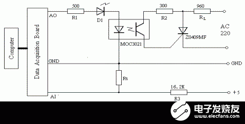 电路中,RL为加热棒;Rt为负温度系数热敏电阻;MOC3021为光耦;Z0409MF为可控硅;Date Acquisition Board (DAQ)是数据采集卡Lab-PC-1200, AO、AI和GND分别是它的模拟输出端、模拟输入端和接地端。其中数据采集卡Lab-PC-1200的配置如下:模拟输入为RSE模式,单极性,则其输入电压范围为0 to 10 V;模拟输出为单极性,立即刷新模式。模拟输入通道选择ACH0,模拟输出通道选择DAC0OUT,模拟地AGND。