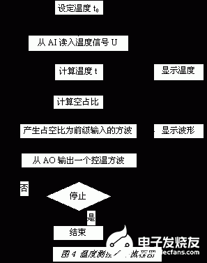 该部分功能由程序控制数据采集卡和计算机实现。热敏电压U由模拟输入通道ACH0(引脚1)引入数据采集卡,在程序中通过公式(10)(11)便可算出温度t,将t与设定温度t0进行比较,其中a与b为百分系数