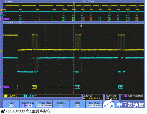 有了MSO4000,工程师可以简便地把示波器输入定义成I2C、SPI、RS-232或CAN总线。这样做的主要好处有三个:第一,如图3所示,用户可以在分组级信息上触发示波器,如特定地址、数据、标识符、未确认等等。第二,定义的每条总线会自动解码,所有分组内容都在显示屏上用直观的总线波形表示。第三,可以使用Wave Inspector的搜索功能,搜索很长的串行总线采集数据,立即找到确定的感兴趣的事件。