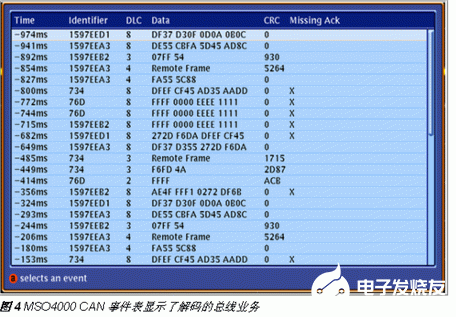 每次在仪器上显示总线时,用户都可以启动一个事件表来查看总线活动。事件表令用户能够以列表格式查看解码的并行或串行总线数据。这些表格为查看波形中的重要事件提供了快速的表格方法。图4是CAN总线采集实例,其中包括解码的标识符、数据长度代码(DLC)、数据、CRC和未确认信息。此外,每个分组带有时戳,可以简便地进行时序测量。