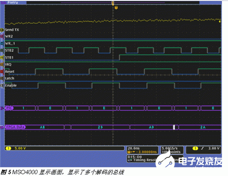 许多工程师用了无数个小时在示波器上解码系统的总线活动。这一工作中一般需要评估每个时钟边沿上的数据状态和地址线。由于MSO4000能够建立并行总线,它简化了这一工作。通过指定特定通道为时钟线和数据线,用户可以建立并行总线显示,自动解码总线内容,如图2所示。