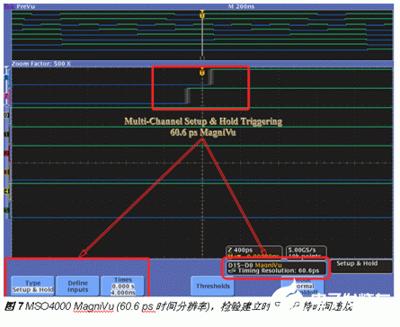 由于下一代微控制器实现了100 MHz以上的时钟速率,采用拥有足够分辨率的仪器对于解决具有高时间密度问题至关重要。MSO4000是唯一提供 MagniVu?超高分辨率信号采集技术的混合信号示波器。MagniVu以最高60.6 ps的分辨率对所有数字通道提供10,000个样点采样。由于这种超高时间分辨率,设计人员可以从简单地调试表面问题转向实际检验极为紧凑时间余量。图6是MagniVu时间分辨率的实例,它以非常精细的时间分辨率检验建立时间和保持时间违规。