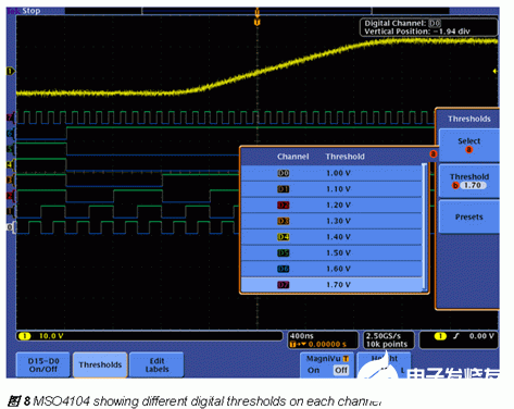 而在MSO4000中,用户可以每条通道设置单独门限,更有效地找到和解决问题。每条通道设置单独门限使得MSO4000混合信号示波器的灵活性和效率远远超过了市场上的任何其它产品。