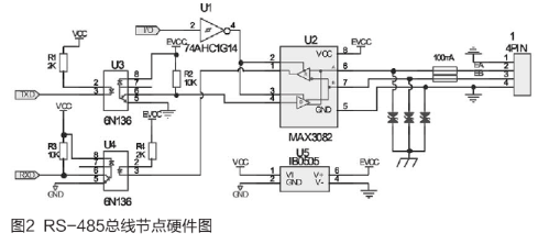 由于系统安装在通信设备密集的地区,现场情况复杂,各个节点之间存在很高的共模电压。RS-485标准采用的是差分传输方式,具有一定的抗共模干扰的能力,当共模电压为-7V~+12V之间时可以保证通讯的正确性,但是当共模电压超过RS-485接收器的极限范围时,接收器将无法正常工作,严重时甚至会损坏芯片。