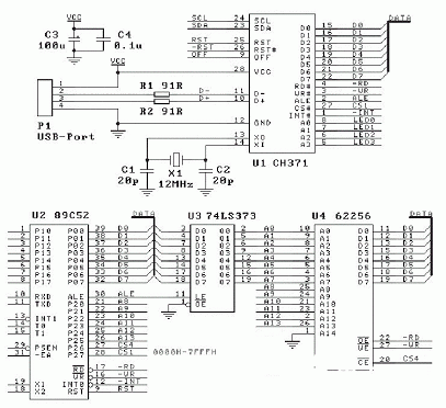 USB接口提供数据交换及供应(经适当变换后供高速AD使用),CH371在12M晶振下倍频工作,提供与单片机接口的同时提供看门狗复位输出功能,I2C主控功能没有使用,A3~A0可以由计算控制驱动4只LED作为工作显示信号。单片机89C52的P1口组用于控制,包括量程转换控制、AD触发信号、采集数据溢出信号等;高速缓存62256通过的CPLD控制存放高速AD采集的结果,单片机定时将其中数据读出经CH371传送到计算机的数据显示和分析软件,实现虚拟示波器功能。单片机、CH371和RAM部分原理图如下: