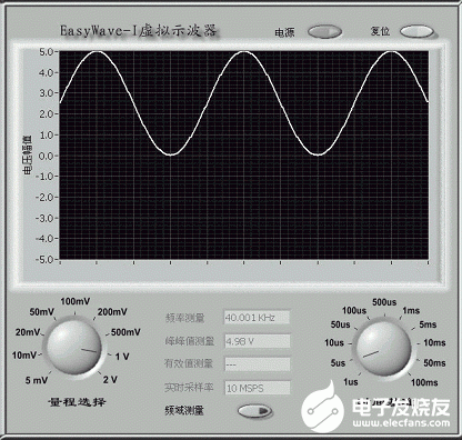 计算机端软件主要功能是模拟一个示波器的界面,实现数据的显示以及满足不同需要的分析功能,同时完成对数据采集硬件的参数设定。在这个设计中已经实现了基本的功能,虚拟示波器的界面如下图。进一步开发后可以实现量程的自动转换、数据的深度分析(譬如波形测量、分析等),甚至可以结合硬件的升级实现、、扫频仪、等功能。