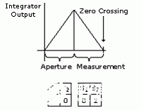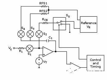 在积分阶段,在图2中用t孔径表示,S1被打开,Vx被施加在R1上,它表示积分斜坡开始。反电流以固定间隔通过开关S2和S3进行施加。这样就可以“平衡”对C1的充电。每次将S5连接到VR的时候,都会产生测量计数。实际上,对于更高分辨率的测量(延长积分次数)而言,大多数计数是在t孔径阶段产生的。在电荷平衡阶段的末尾,和双斜坡转换器的情形一样,将对积分器施加一个精确的参考电流。积分器将逐渐下降直到跨越零点。测量是从在积分阶段中积累的计数计算得到的,通过和在下降阶段积累的计数的加权求和。制造商使用两个或更多的下降参考,这样可以得到更快的下降阶段提高速度,还可以减缓“最终斜坡”得到更高的精度。